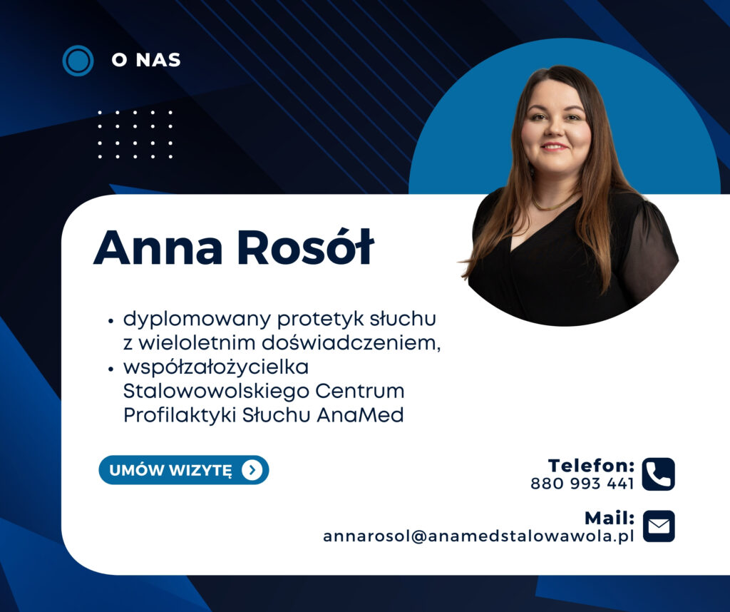 Anna Rosół, współzałożycielka AnaMed, to doświadczony protetyk słuchu i pedagog, która od blisko 10 lat pomaga pacjentom odkrywać na nowo świat dźwięków. Jej pasja i zaangażowanie sprawiają, że każdy pacjent może liczyć na profesjonalną opiekę oraz indywidualne podejście. Specjalizuje się w doborze i dopasowywaniu aparatów słuchowych, a jej spokój i cierpliwość pomagają nawet najbardziej zestresowanym osobom czuć się komfortowo podczas wizyty. Stale podnosi swoje kwalifikacje, uczestnicząc w branżowych konferencjach i szkoleniach.