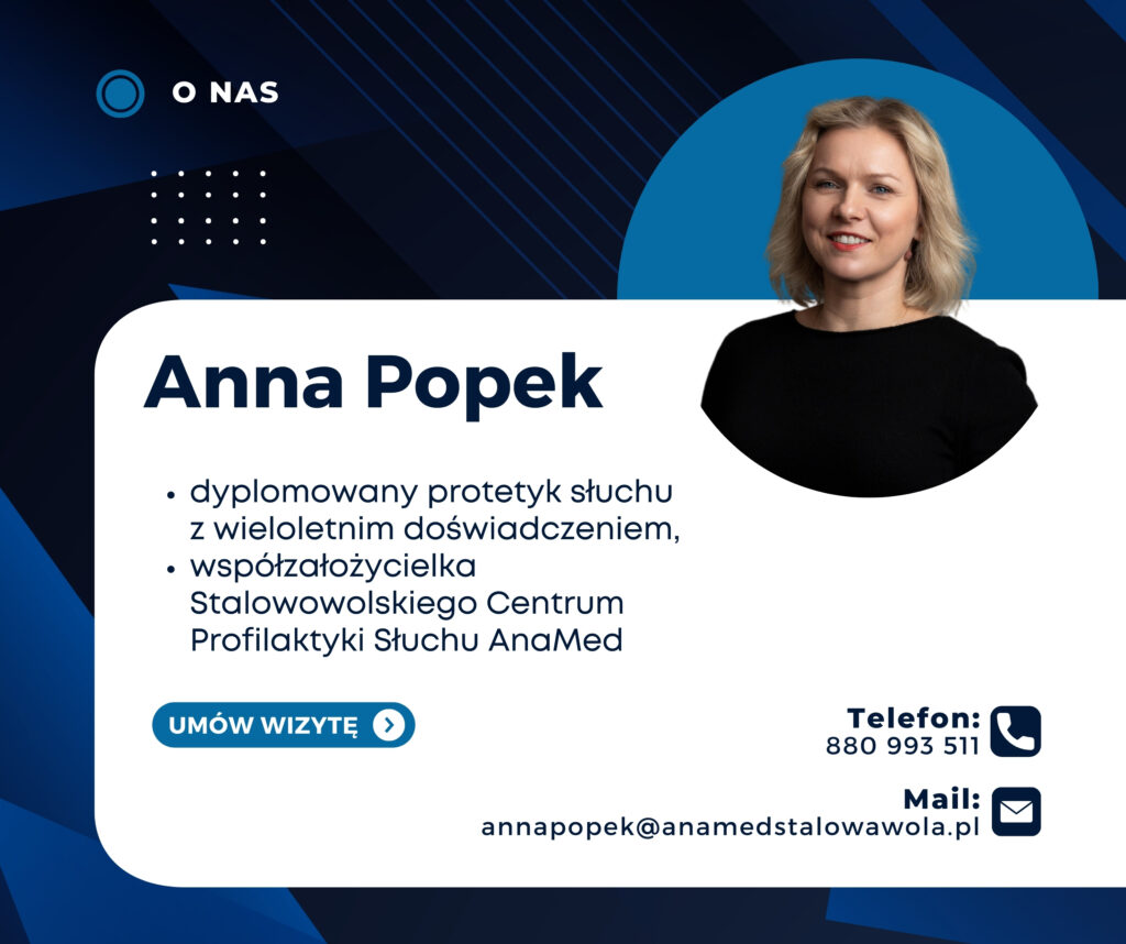 Anna Popek, współzałożycielka AnaMed, to protetyk słuchu i ekonomista, która dzięki wieloletniemu doświadczeniu doskonale rozumie potrzeby pacjentów. Jej serdeczność i pozytywne nastawienie sprawiają, że każda wizyta odbywa się w miłej i bezpiecznej atmosferze. Umiejętnie dopasowuje aparaty słuchowe do indywidualnych potrzeb, pomagając pacjentom odzyskać komfort słyszenia. Nieustannie rozwija swoje kompetencje, uczestnicząc w szkoleniach i konferencjach branżowych.